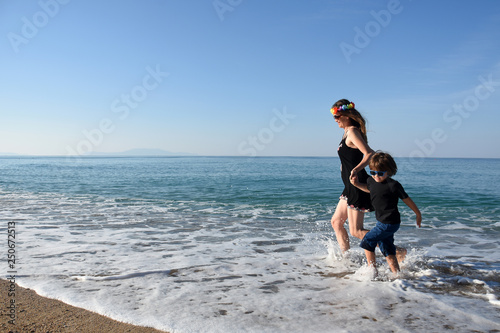 Mother and son playing on the beach. Mom and child holding hands and running to the sea