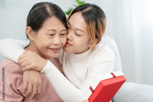 Mother day, cute asian teen girl hugging and kissing on the cheek, mature middle age mum. Love, kiss, care, happy smile enjoy family time. celebrate special occasion, happy birthday, merry Christmas.