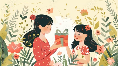 celebration, greeting, gift, present, love, mother, day, holiday, happy, woman, background, decoration, birthday, design, concept, card, bouquet, surprise, flower, mother, female, congratulation, beautiful, spring, box, girl, children, invitation, home, mother's day, family, nubes, anniversary, floral, young, eltern, romantic, together, illustration, pink, mother's day, children, banner, smile, carnation, copy space, art, summer, label