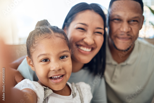Mother, father and child take a selfie as a happy family relaxing on a peaceful and calm weekend together. Portrait, mom and dad enjoy bonding and taking pictures with a young girl or child at home