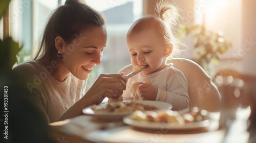 mother, toddler, feeding, breakfast, kitchen, sunlight, family, bonding, love, care, parenting, children, food, eating, indoor, morning, happy, smiling, warmth, cosy, soft light, nurturing, motherhood, family time, casual attire, home, nourishment, eltern, baby, affection, healthy, early morning, peaceful, relaxed, tender, routine, morning meal, baby food, february 14, mother's day