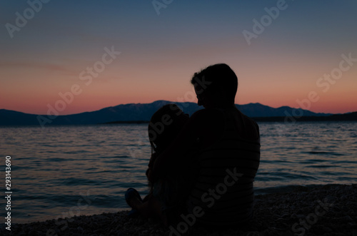 Mother holding her baby girl in her lap, sitting on a beach after sunset.