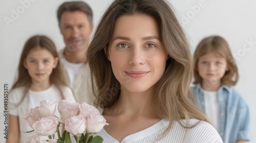 family, mother, woman, portrait, daughter, son, love, happiness, togetherness, affection, bonding, beautiful, smiling, cheerful, joyful, positive, indoor, studio shot, closeup, pink rose, flower, bouquet, casual clothes, lifestyle, people, human relationships, generation, family life, warmth, connection, happy family, eltern, children, motherhood, fatherhood, domestic life, well-being, contentment, oneness, support, caring, gentle, tenderness, portraiture, caucasian, adult