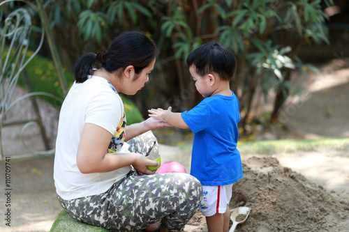Mother is take care of her son on playground