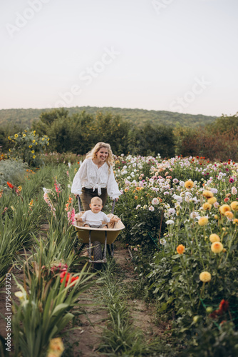 mother, son, baby, family, eltern, children, wheelbarrow, flower, field, garden, dahlia, walking, pushing, together, joy, happiness, childhood, love, bonding, parenthood, summer, outdoors, nature, floral, blooming, plant, vibrant, colourful, smiling, carefree, leisure, activity, rural, casual attire, lifestyle, genuine, authentic, green, natural, light, warm, season, healthy, well, being, growth, development, day, outside