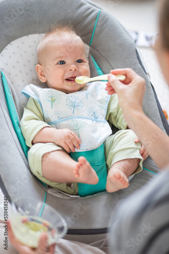 Mother spoon feeding her baby boy infant child in baby chair with fruit puree. Baby solid food introduction concept.