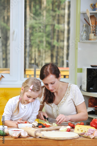 cheese, cooking, cookery, dough, flour, food, fresh, grain, ingredient, kitchen, kneading, meal, mozzarella, onion, pepper, pepperoni, pizza, preparation, cucumber, roller, rolling, round, salami, sauce, slice, spice, table, tasty, tomatoes, vegetable, wooden, mother, children, daughter, girl, childhood, children, egg, spoon, greener, arugula, spinach