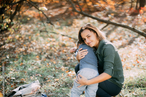 mother with son three years in autumn the forest, embrace and tenderness