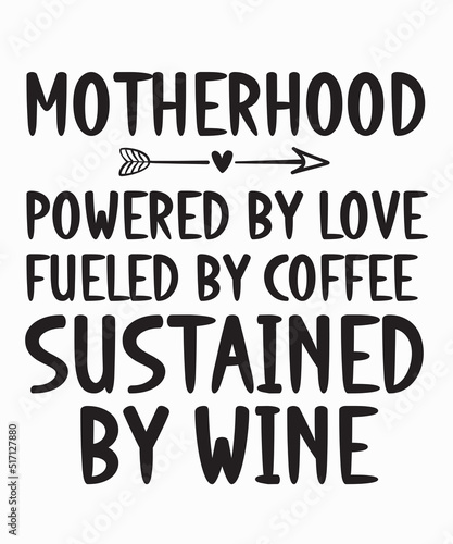 Motherhood. Powered by love. Fueled by coffee. Sustained by wineis a vector design for printing on various surfaces like t shirt, mug etc.