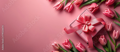 Mother's Day concept. Top view photo of stylish pink giftbox with ribbon bow and bouquet of tulips on isolated pastel pink background with copyspace