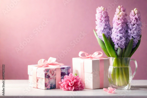 Mother's Day or Women's Day greeting card with bouquet of Hyacinths and gifts box on wooden table.