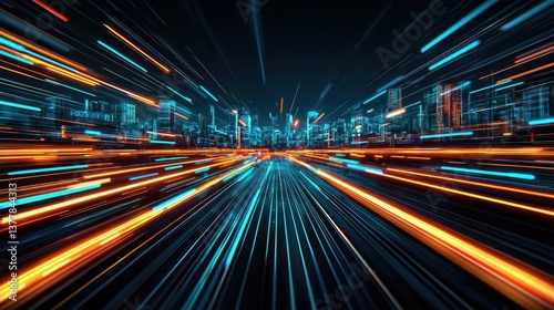 Motion blur city in digital cyberspace with future skyline concept. Dynamic cityscape with streaks of light illustrating motion.