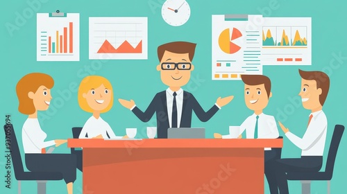 Motivating Sales Team to Achieve Targets: Illustration of a Sales Manager Leading a Team Meeting with Sales Charts and Strategies