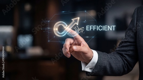 Motor Efficiency: A businessman's hand interacts with a glowing digital efficiency symbol and text.