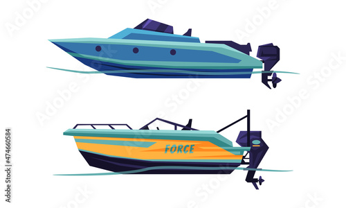 Motorboat or Speedboat as Watercraft or Swimming Water Vessel Powered by Engine Vector Set