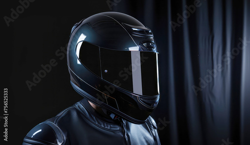 Motorcyclist in a black jacket and a modern sleek black helmet on a dark background