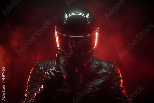 Motorcyclist in helmet on dark background in the red neon lighting pointing finger up demanding attention on the road.