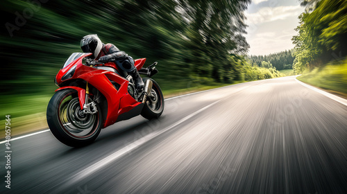 Motorcyclist riding a red sport bike on a curvy road. A rider in full gear speeds down a winding road, with motion blur emphasizing the high speed