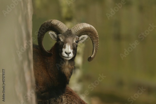 mouflon (Ovis orientalis orientalis) close up portrait. Close-up portrait of mammal with big horn, Czech Republic.