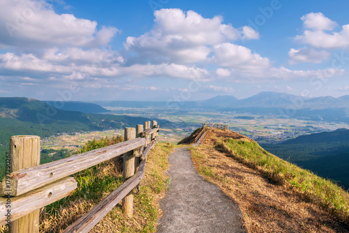 aso, autumn, beautiful, blue skies, caldera, cliff, countryside, famous place, field, geology, grass, highland, hike, hiking, japan, japanese, kyushu, landmark, landscape, lookout, meadow, mount, mountain, national, national park, nature, north, observatory, overlook, park, path, rim, scenery, scenic, sunshine, holiday maker, trail, vale, view, viewpoint, volcanic, volcano