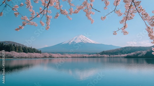 mountain, fuji, mount, japan, lake, water, sky, blue, tree, cherry, blossom, flower, pink, white, snow, peak, landscape, nature, scenic, beautiful, travel, springtime, tranquil, serene, calm, peaceful, picturesque, vibrant