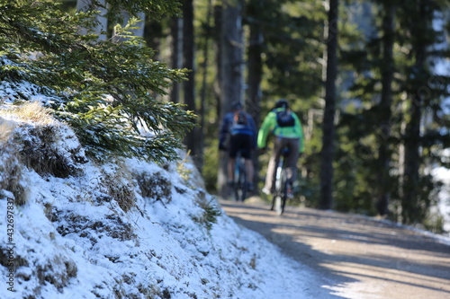 winter, snow, forest, mountain, nature, bike, road, trail, landscape, hiking, sport, woman, cold, bicycle, walking, tree, outdoors, cycling, park, wood, tree, path, people, mountain, family
