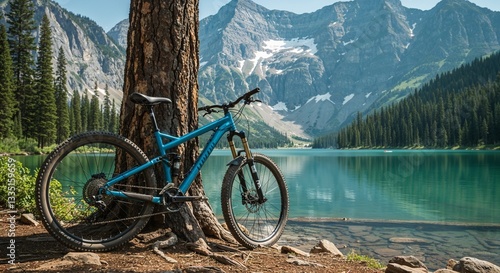 mountain bike, lake, nature, calmness, scenic, outdoors, blue, adventure, landscape, recreation, summer, tree, cycling, fitness, exploration, environment, travel, serenity, peaceful, sport, leisure, water, mountain, trail, bicycle, wildlife, hill, sunlight, activity, journey, pedal, forest, view, biking, healthy, vacation, excitement, trekking, natural beauty, relaxation, wilderness