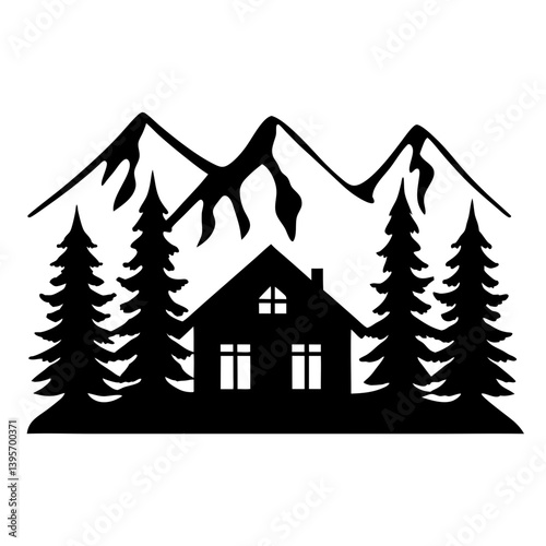 mountain, cabin, wood, scenic, view, black, white, illustration, tree, forest, pine, evergreen, nature, landscape, design, graphic, silhouette, artwork, art, image, picture, drawing, vignetting, vector, clip art, icon, symbol, logotype, minimal, simple, house, home, bungalow, chalet, winter, snow, peak, range, hill, outdoors, wildlife, vacation, travel, adventure, escape, relaxation, peaceful, serene, calm