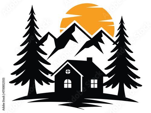 Mountain Cabin Landscape with Pine Trees and Sunrise Silhouette Illustration