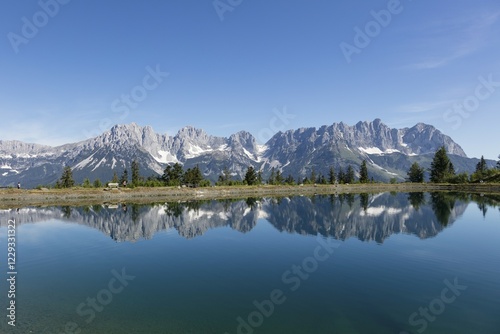 Mountain lake at Astberg, Astbergsee, water reflection, Going, Wilder Kaiser, Kaisergebirge, Kitzbüheler Alps, Tyrol, Austria, Europe