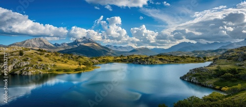 mountain, lake, sky, water, nature, landscape, blue, cloud, hill, green, summer, day, travel, photo, scenery, peaceful, beautiful, calm, serenity, calmness, panorama, view, wild, fresh, horizon, natural, outdoors, alpine, park, vista, scenic, picturesque, rock, grass, sun, bright, gorgeous, environment, mountainous