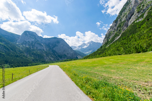 road, mountain, landscape, sky, nature, alps, mountain, green, grass, summer, travel, blue, vale, alpine, cloud, hill, rural, meadow, view, forest, scenic, tree, asphalt, europa, path, environment, countryside, field, panorama, spring, scenery, horizon, country, outdoors
