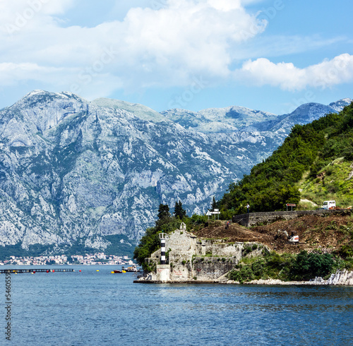 Mountain landscape and old lighthouse in Kotor bay, Montenegro.