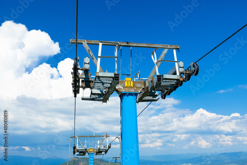 Mountain landscape with cable car and forest. Travel and adventure concept. Funicular on the top of big mountain