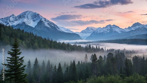 Mountain landscape with forest, fog, and snowcapped peaks at sunrise