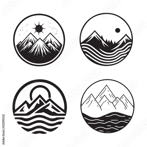 Mountain Landscapes with Sun and Waves – Four Circular Vector Logos