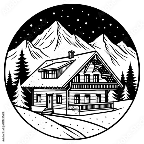 cabin, filed, mountain, landscape, alpine, nature, snow, tree, forest, architecture, home, outdoors, scenery, bungalow, holiday, travel, vacation, black-and-white, illustration, design, winter, rural, panorama, scene, vintage, background, print, tree, peak, scenic, snowy, graphic, mountain, country, residence, park, view