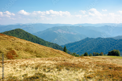 mountain meadow on a sunny autumn day. dry grass on the hills. mountain range rolling in to the horizon. fluffy clouds on the blue sky at high noon