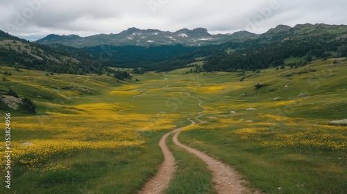 Mountain meadow vista with winding path. A scenic valley with a network of trails through a vibrant mix of green and yellow wildflowers, leading to a distant mountain range