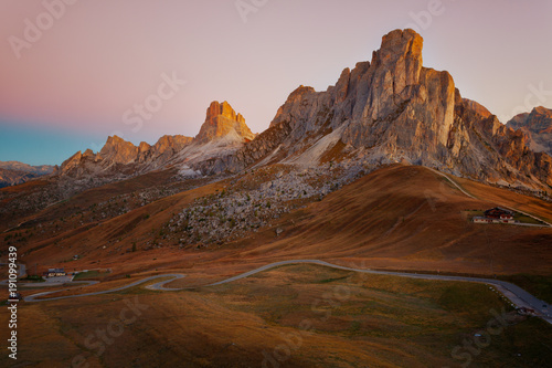 Mountain Passo Giau in Dolomite Alps at sunrise, Italy