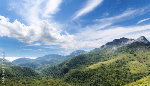 Mountain peak landscape with blue sky and clouds. Panoramic view