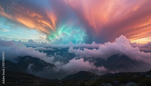 mountain, peak, emerging, cloud, sky, colourful, fog, mist, landscape, nature, scene, altitude, terrain, rock, stone, scenic, view, travel, exploration, adventure, horizon, aerial, overcast, day, weather, dramatic, atmosphere, serene, light, colours, formation, pattern, ground, panorama