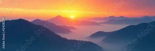 Mountain peaks shrouded in mist fade into the orange glow of sunset, peacefulness, clouds, solitude