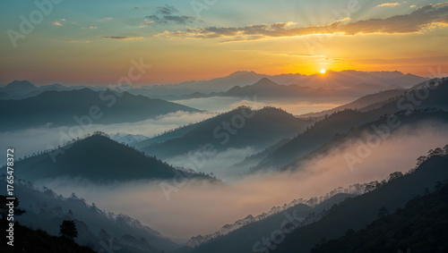 Mountain range at sunset, orange yellow sky sunbeams, foggy mist covering peaks and valleys, silhouetted mountains, peaceful serene landscape, inspiring natural beauty generative AI