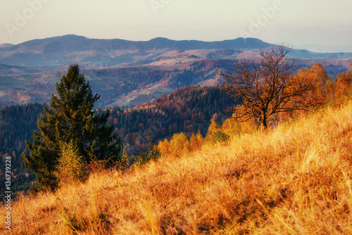 autumn, mountain, hill, hiking, birch, tree, trail, meadow, foliage, natural, hike, green, travel, view, red, european, yellow, leaf, sunny, scenery, orange, grass, outside, vegetation, sunshine, countryside, season, wood, stem, colours, pasture, fall, blue, weather, plant, beauty, rural, sky, scenic, outlook, gold, scene, beautiful, background, path, land, europa, landscape, timberland