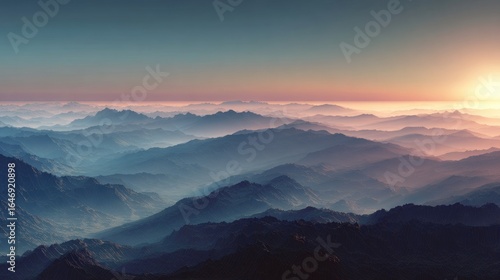 mountain, range, landscape, sunrise, mist, peak, sky, cloud, view, horizon, nature, outdoors, terrain, vale, light, colours, warm, gold, aerial, distant, scenic, huge, serene, tranquil, peaceful, morning, dawn, elevation, geography, wilderness, travel, adventure, explore, background, pattern, texture, formation