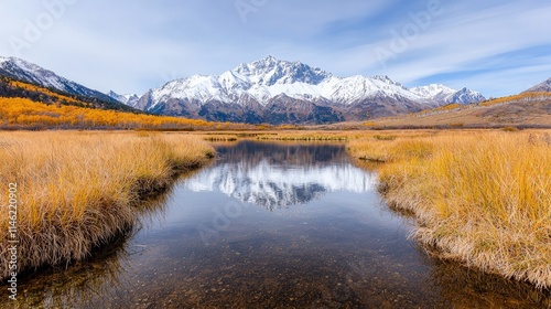 mountain, water, autumn, fall, lake, duck pond, river, stream, snow, peak, landscape, nature, scenery, wilderness, environment, travel, photo, image, picture, view, scenic, beautiful, majestic, serene, tranquil, peaceful, calm, quiet, still, clear, bright, sunlight, sky, cloud, tree, yellow, gold, grass, plant, vegetation, rock, stone, colours, season, cold