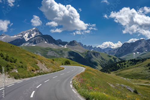 Mountain road curving through lush valley under blue sky. Concept of scenic drive and summer exploration.