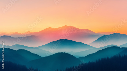 Mountain Sunrise: A breathtaking view of majestic mountain ranges fading into the horizon at sunrise, showcasing layers of blue and green, bathed in the warm hues of orange and pink.