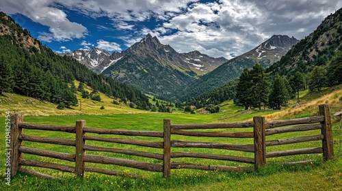 mountain, vale, pasture, fence, landscape, summer, green, scenic, nature, sky, cloud, tree, grass, wood, rural, field, travel, holiday, adventure, view, scenery, beautiful, serenity, peaceful, relaxing, calm, tranquil, majestic, panorama, open, space, wild, countryside, farm, alpine, hillside, horizon, sunlight, bright, fresh, ecosystem, photo
